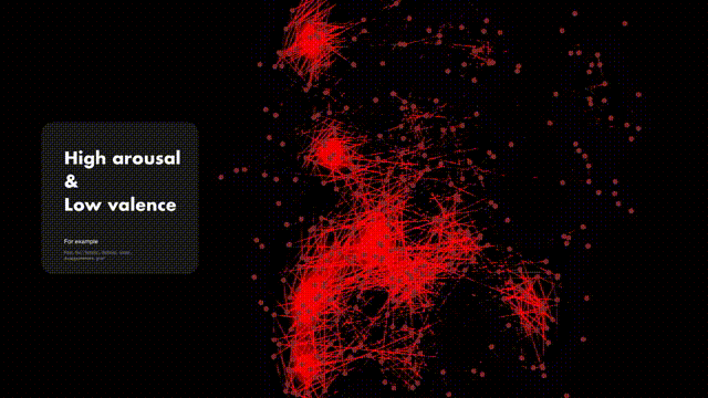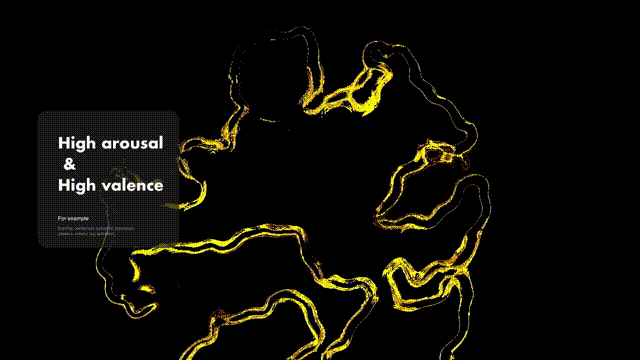 我们通过搭建科普实验可视化网站,让更多人了解情绪和了解自己。网站以展现当下抑郁症现状为入口,引导人们上传表达自己情绪的照片,并生成对应音乐和视觉享受,通过有趣的交互方式让人们了解、表达和分享自己的情绪。算法中以颜色与声音的共感理论为基础,分析图像颜色的三要素(颜色、亮度、饱和度)和声音的三要素(音色、音调、响度),引入Opencv进行图片颜色识别,匹配数据库中标签“happy”、“sad”、“peace”、“angry”四种情绪界定的音乐,使用Touchdesigner进行音乐可视化设计,实现情绪图像生成音乐的可视化的过程。