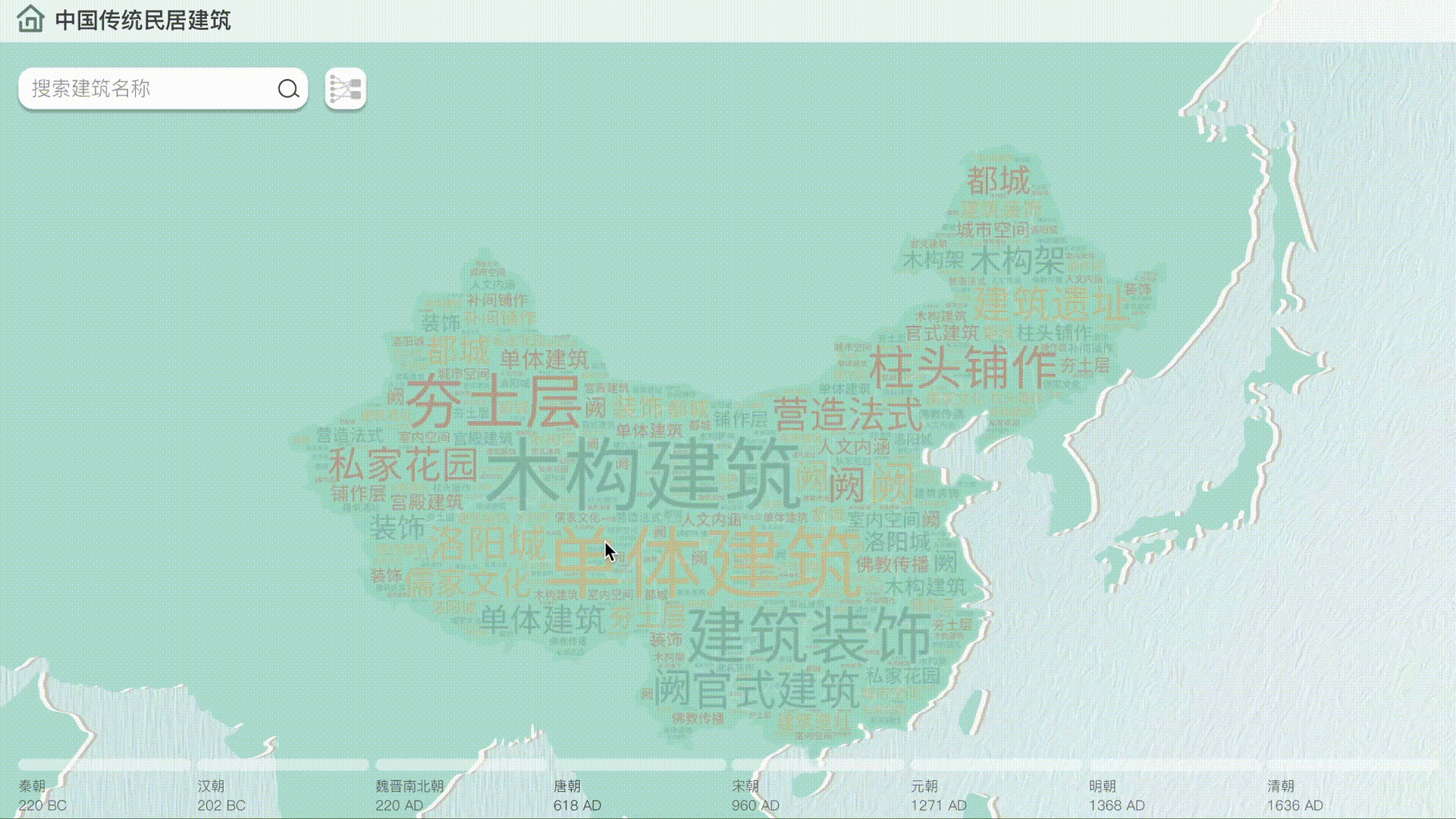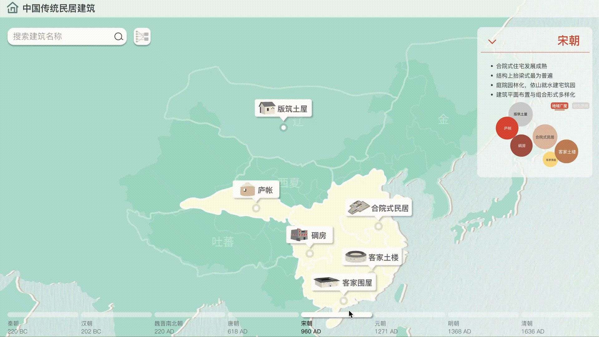 该可视化设计作品归纳了中国民居建筑从古至今在空间与时间发展过程中——地理分布、空间布局、建筑形制、室内装饰、精神内涵等方面的演变,展示中国民居建筑设计风格的演变趋势。以时空地图的形式引入,既可直观对比各朝各代的疆域变化,也可快速检索各朝代的代表民居建筑及其分布位置与广度;同时,也在时间维度表现了民居建筑的发展,更多民居建筑细节可点击了解。在该设计中,将现有研究的大量枯燥文字以生动的图形、图像、图表等形式可视化出来,更易于人们了解中国古代民居建筑。