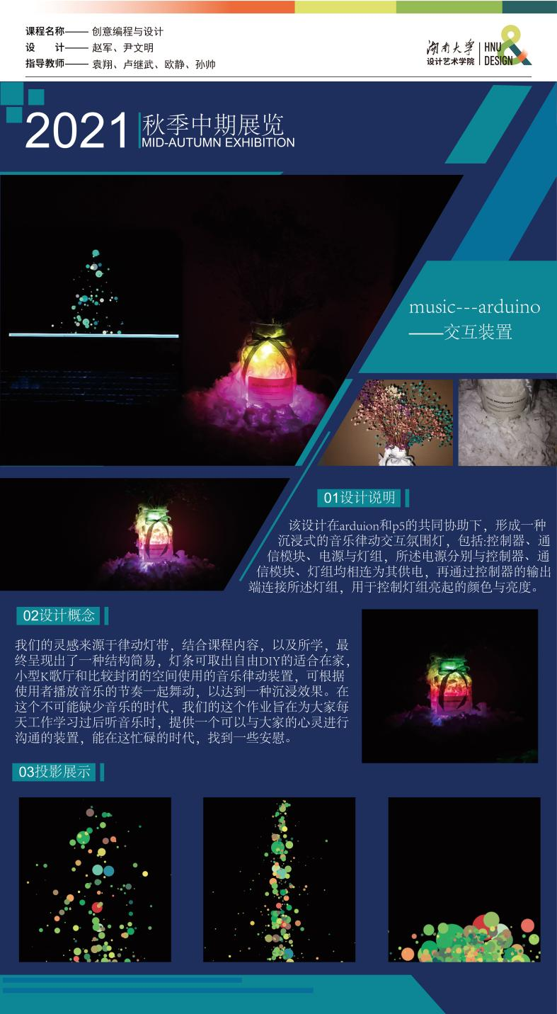 该设计在arduion和p5的共同协助下,形成一种沉浸式的音乐律动交互氛围灯,包括:控制器、通信模块、电源与灯组,所述电源分别与控制器、通信模块、灯组均相连为其供电,再通过控制器的输出端连接所述灯组,用于控制灯组的颜色与亮度。