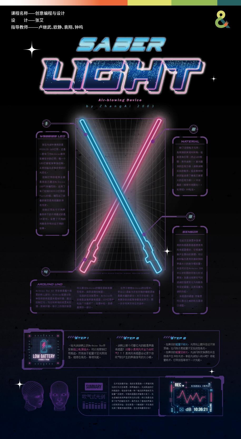 我的吹气式光剑是一个基于Arduino的创意交互灯光项目。硬件采用Arduino Uno开发板、麦克风声音传感器和ws2812B LED灯带。通过编程,将传感器捕捉到的声音信号进行采集,从而控制光剑中的光带,达到灯带起起落落的效果。