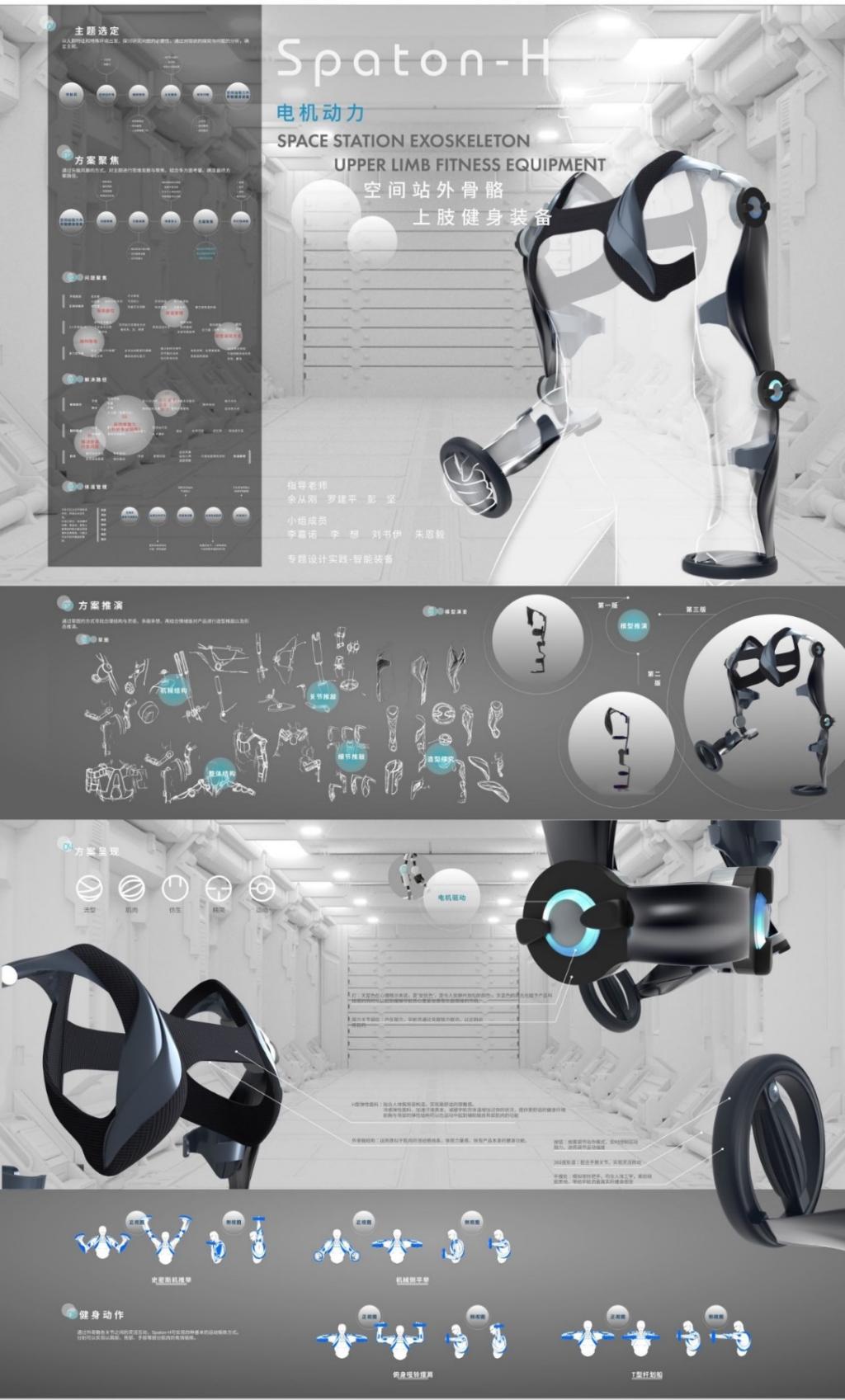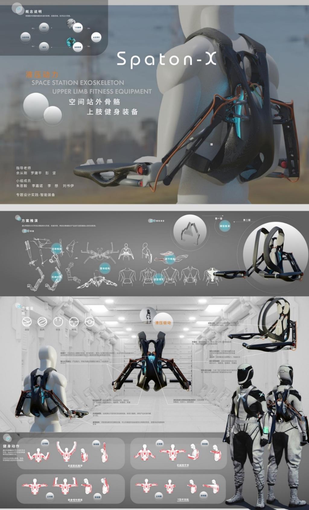 Spaton是专门针对于空间站环境中上肢锻炼场景设计的主动供阻外骨骼,其中包含Spaton-X和Spaton-H两款型号。Spaton-X采用新式的悬臂结构,碳纤维外壳,液压驱动。Spaton-H采用电机驱动,肩部自由度集成设计。航天员穿戴好外骨骼,在平板上选择运动模式之后,外骨骼会根据使用者的生理数据模型提供合适阻力,引导使用者完成锻炼任务,同时进行生理指标监测,实时反馈给地面科研人员。spaton内置四款针对不同肌肉群的运动模式,整体质量轻盈,体积小巧,坚实稳固,能够很好帮助未来的空间站环境中的航天员进行上肢锻炼。