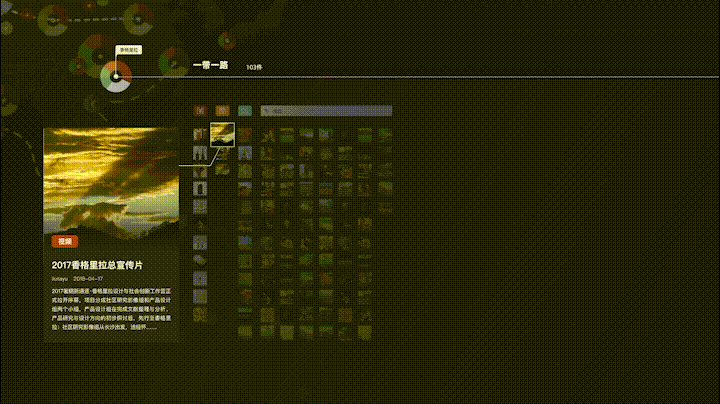 此方案为一带一路双屏交互可视化设计,大屏作为展示端,小屏作为控制端。大屏基于地区以环形图进行设计、报告、活动和视频四种类型数据展示,左侧为项目总数以及地区分类,右侧为项目地点卡片展示,背景可通过透明度变化切换不同作品卡片。用户在控制屏内可进行内容选择与内容控制,对应大屏将展开项目详情卡片与详情展示。