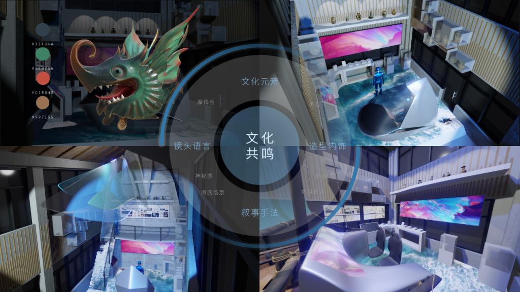 长沙窑文化体验场景设计项目通过提取文化元素、搭建故事框架、渲染场景氛围,为参观者营造沉浸式体验的同时,将公司长沙窑相关科研成果及项目案例进行汇总和展示。交互内容上,根据“黑石号”历史背景,结合“胡旋舞”、“摩羯鱼”等富有特色的纹案造型,输出具有“神秘感”、“沉浸感”、和“科技感”特点的三维化游戏创作。场景设计上,采用“帆船”意象,结合场景尺寸及布展内容类型,合理运用灯光、特殊屏及音效,搭建展示空间。