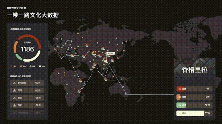 “一带一路”文化大数据可视化设计,收集球王会的文化项目基于地图进行可视化展示。根据项目进行数据分类,后台进行地区、内容、媒体等标签,前台以项目为单位基于地图进行数据展示,控制屏进行数据展示控制,大屏同步展示内容。大屏基于地区以圆圈大小进行数据展示,左侧为项目详情以及地区分类,右侧为所有项目简图合集,动态瀑布流形式进行滚动展示。用户在控制屏内可进行内容选择与内容控制,对应大屏将展开项目详情卡片与详情展示。