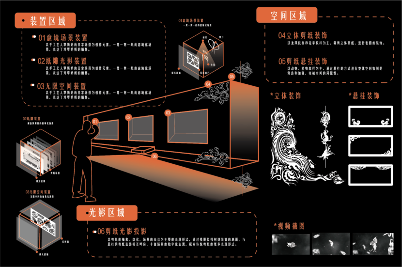 目所及、指所剪、纸所见,这是侗族剪纸艺人覃奶时清的创作理念,也是我们这次剪纸交互装置的设计理念。我们的装置主要有由手工艺人覃奶奶的剪纸场景装置、剪纸光影装置、无限空间装置组成,结合地面剪纸投影和空中立体剪纸悬挂,形成沉浸式的剪纸交互装置空间。我们希望用户可以通过我们的装置“看见”侗族剪纸的独特艺术魅力、“看见”侗族剪纸背后的故事和手工艺人以及“看见”侗族剪纸的传承与创新。