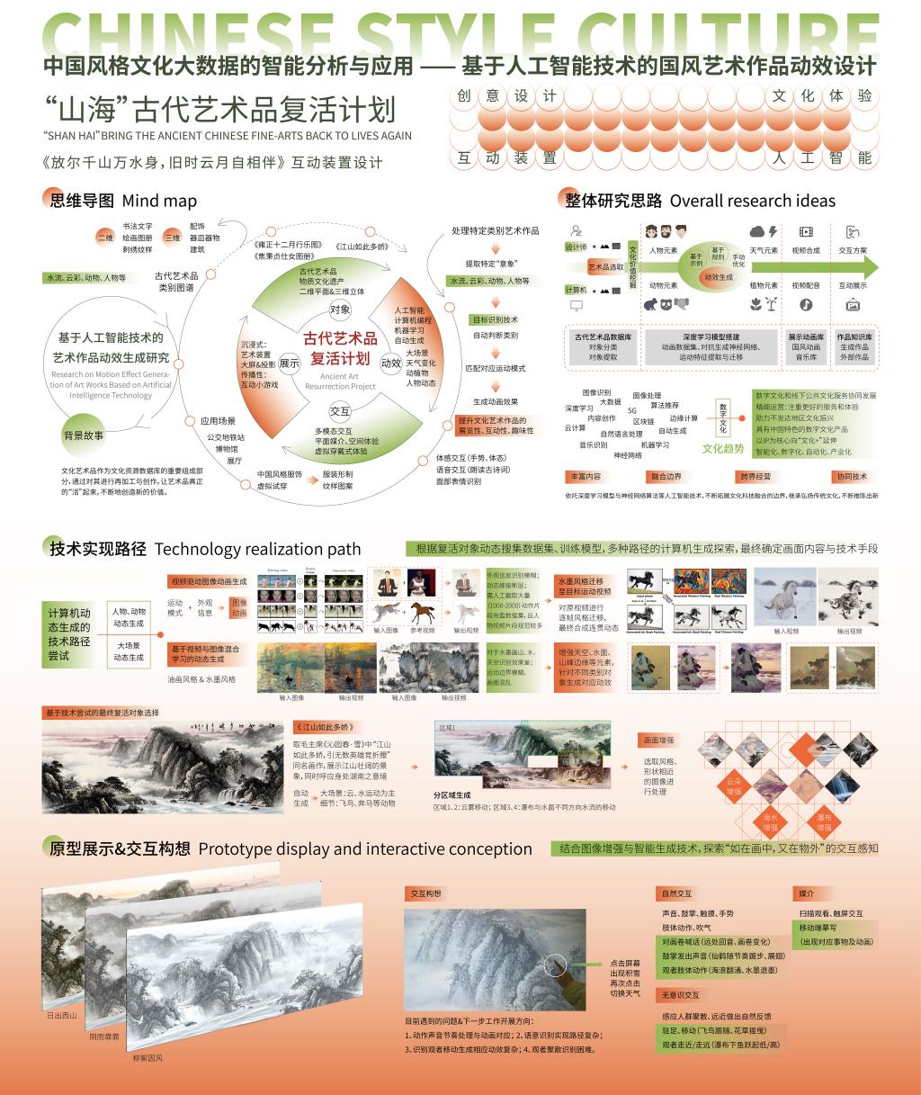 古代艺术品“复活”计划,旨在通过人工智能技术的引入,为古代艺术作品中的特定对象自动生成动画效果,探索能创造出新价值的艺术表现。本组同学聚焦中国风格古代艺术作品,从二维、三维角度梳理文物图谱,选取动效与交互的生成对象原型。通过对技术进行改进,解决了现有方法不能很好地实现国画动效自动生成的问题。让更多艺术品“活起来”,使艺术品以更多元的方式走向大众。