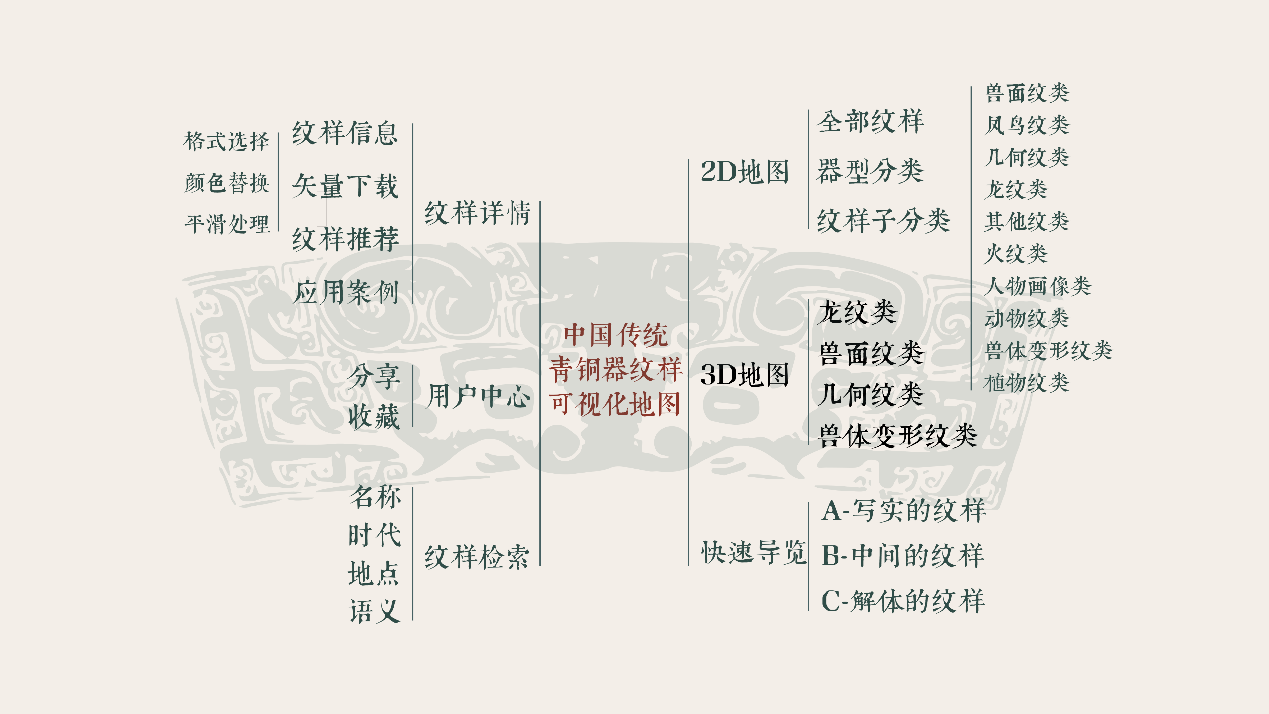 中国的青铜器艺术,经历了夏、商、西周和春秋战国千余年的发展,形成了独具特色的青铜文化。由于商周青铜器纹饰与王权、神权的结合尤为突出,其神秘、独特、璀璨的艺术特征延续了十多个世纪并营造了中国早期文明的极浓厚的神秘氛围。作品收集整理了3471张中国青铜器纹样,整理了1150条纹样标签,采用深度学习技术,基于图像视觉特征,以交互式地图的方式聚类和展示中国传统青铜器纹样。设计师可通过浏览青铜纹样地图,直观地欣赏与选取所需青铜器纹样,通过视觉风格与纹样语义标签,为设计师提供纹样内涵与背后的文化故事。并且通过计算机对纹样进行批量化矢量处理,支持设计师便捷使用古代青铜纹样。