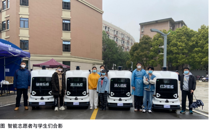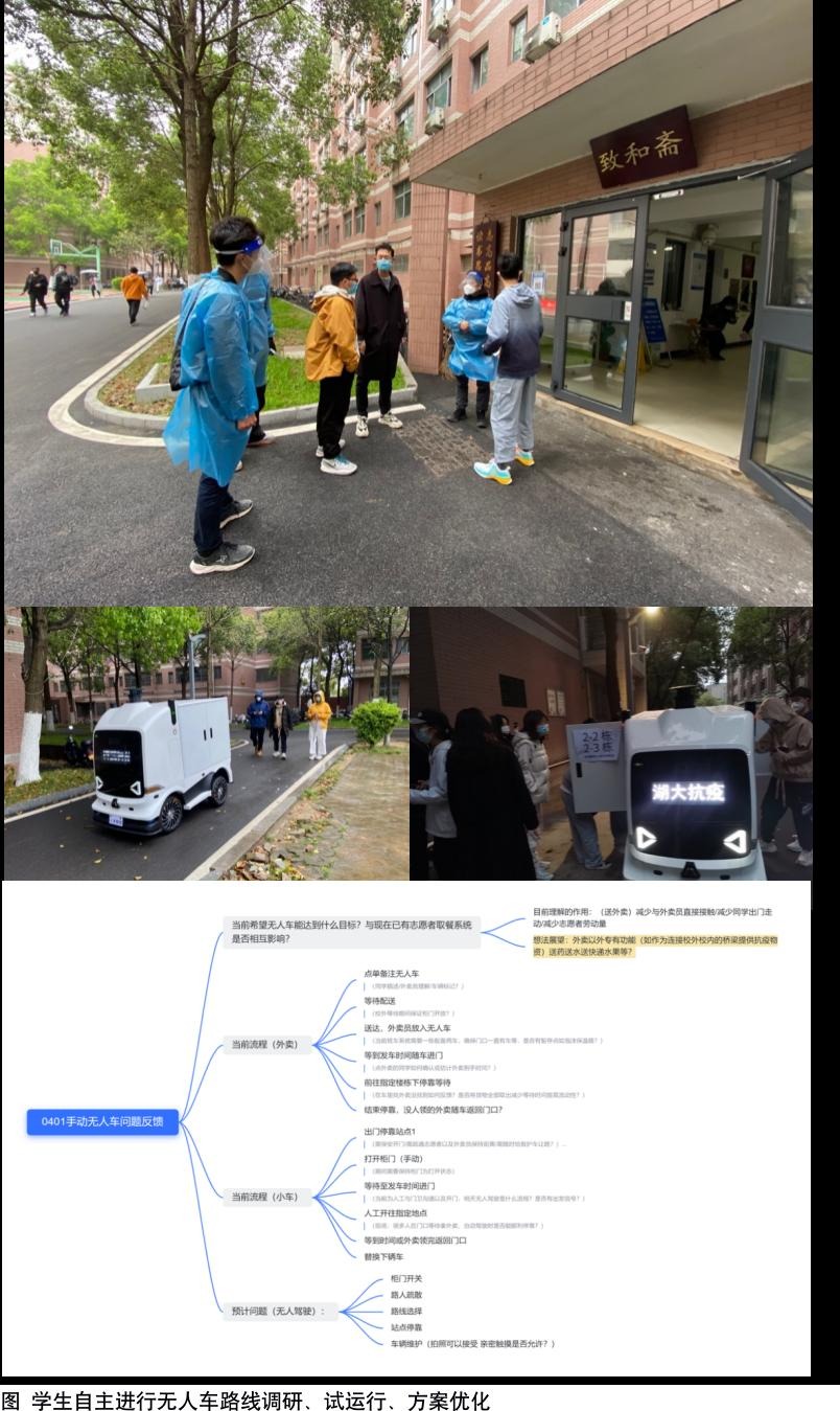 在酒店集中隔离的“智能装备”模块余从刚老师与“行深智能”工程师刘帅经过讨论,立刻抽调了以安全、高可靠性和智能著称的“绝地”系列无人车加入抗疫队伍。该型号无人车无接触配送近三十万公里0事故率,续航里程可达100km/h,采用了双制动系统,冗余传感器防控检测,多重行车安全策略,并且基于时空对准的多源传感器融合感知技术,采用多种类多层级传感器覆盖式布局,全方位感知不同场景的需求。但如何让现有智能工具更好地为实际场景服务,让AI更好地服务人们的生活,把工作留给机器,让人类创造生活,是一个典型的“产品+服务”的设计问题。将课堂搬到了管控区,将“学以致用”的精神发挥在防疫第一线,小车进入园区后,球王会季铁、孟晗、彭坚、胡莹等几位老师和“行深智能”团队身着防护服或远程参与,马上组织了一个真实的“服务设计”现场教学,将抗疫一线的现实问题直接引入教学,如何充分发挥五位智能志愿者的效能?
