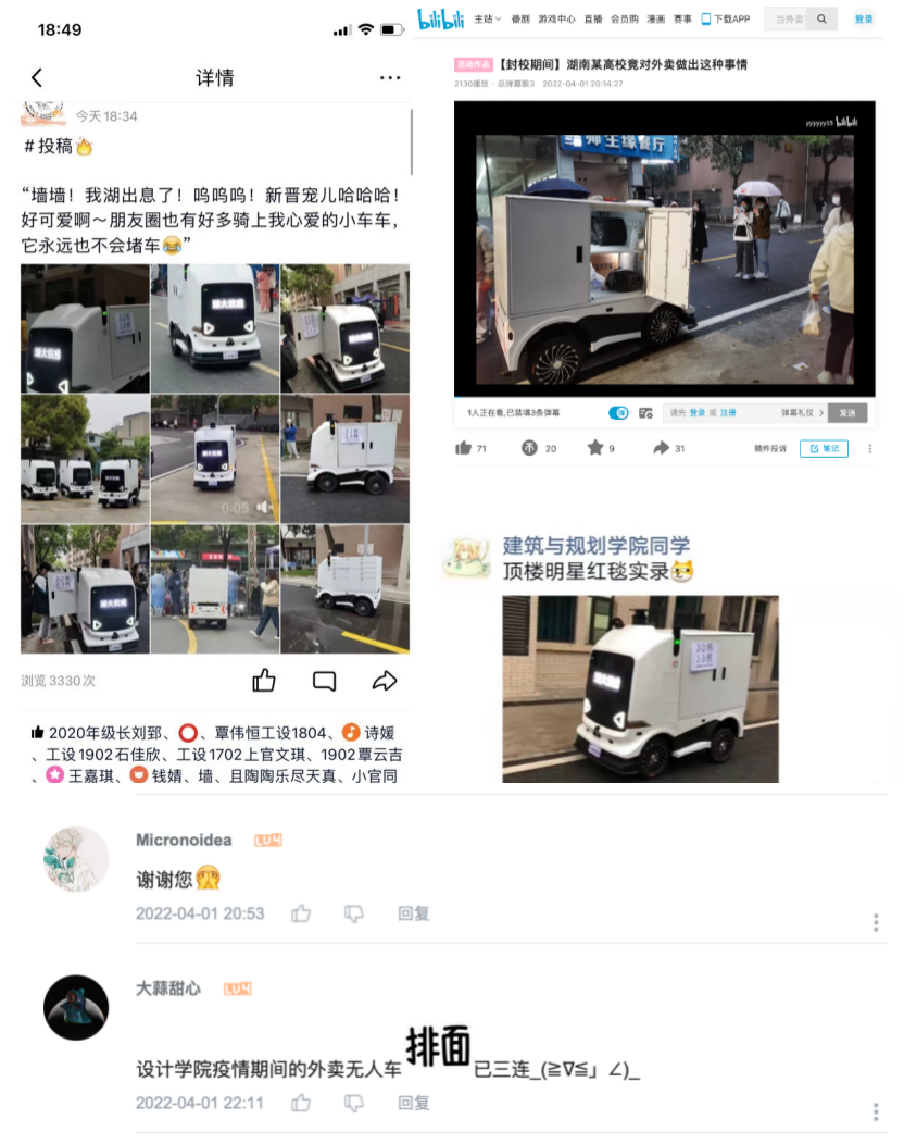 公司志愿者团队开始思考这个实实在在的“快题”和“真问题”,每个接触点都是他们熟识的人:外卖小哥、保安大叔、同学朋友...而整个动线的场域就是他们日日生活的公寓。经过几轮测试和用户反馈分析设计流程的原形迭代,到晚餐时间第一个测试点的外卖服务运行已经开始,测试行驶时,技术人员为无人车设置了15km/h的速度上限,小车被同学们操控着悠哉穿行在雨中的马路上, 十分亮眼,到晚上时,园区的同学更加是反响热烈并受到媒体关注。