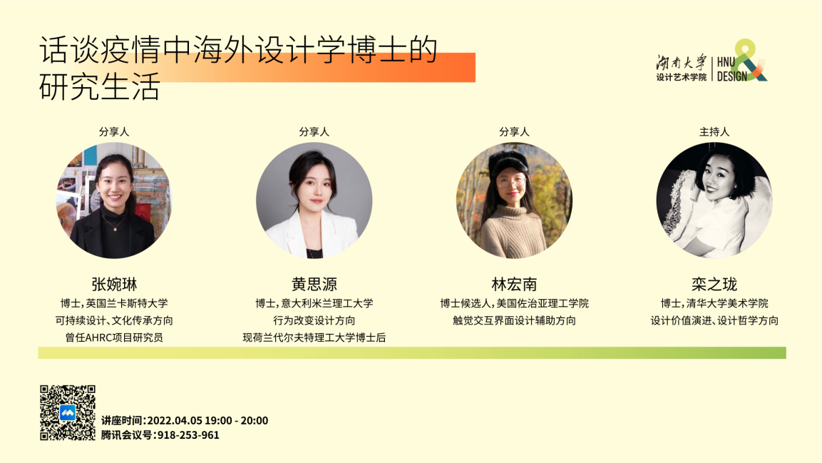 在“在线学习”和疫情隔离的背景下,曾经有过相同经历的学姐们希望通过讲述自己的真实故事,为受到疫情影响的同学们带去一些关于生活、学习、择业的新启发。第1期我们有幸邀请到了来自英国、意大利、美国的三位设计学博士研究生与大家在线分享。