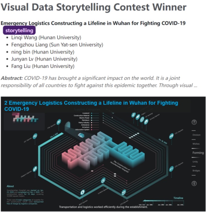 《Emergency Logistics Constructing a Lifeline in Wuhan for Fighting COVID-19》是一个数据驱动的交互叙事可视化作品。团队采用新颖的可视化形式,以新冠疫情大爆发后,应急物流打通武汉物资支援生命线,向世界传达真实温情的中国故事,鼓励全球人民为早日击溃新冠病毒互相援助,作品展示了数据可视化技术在故事叙述和传播的卓越能力。