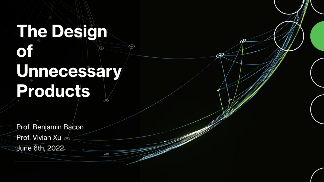 昆山杜克大学Benjamin Bacon和Vivian Xu的课堂以“The Design of Unnecessary Products”为主题,面向未来消费社会中设计、人造物与环境的关系,探讨在思辨设计、产品服务系统与可持续设计的维度下,设计理性的演化及其与复杂真实世界的关系。