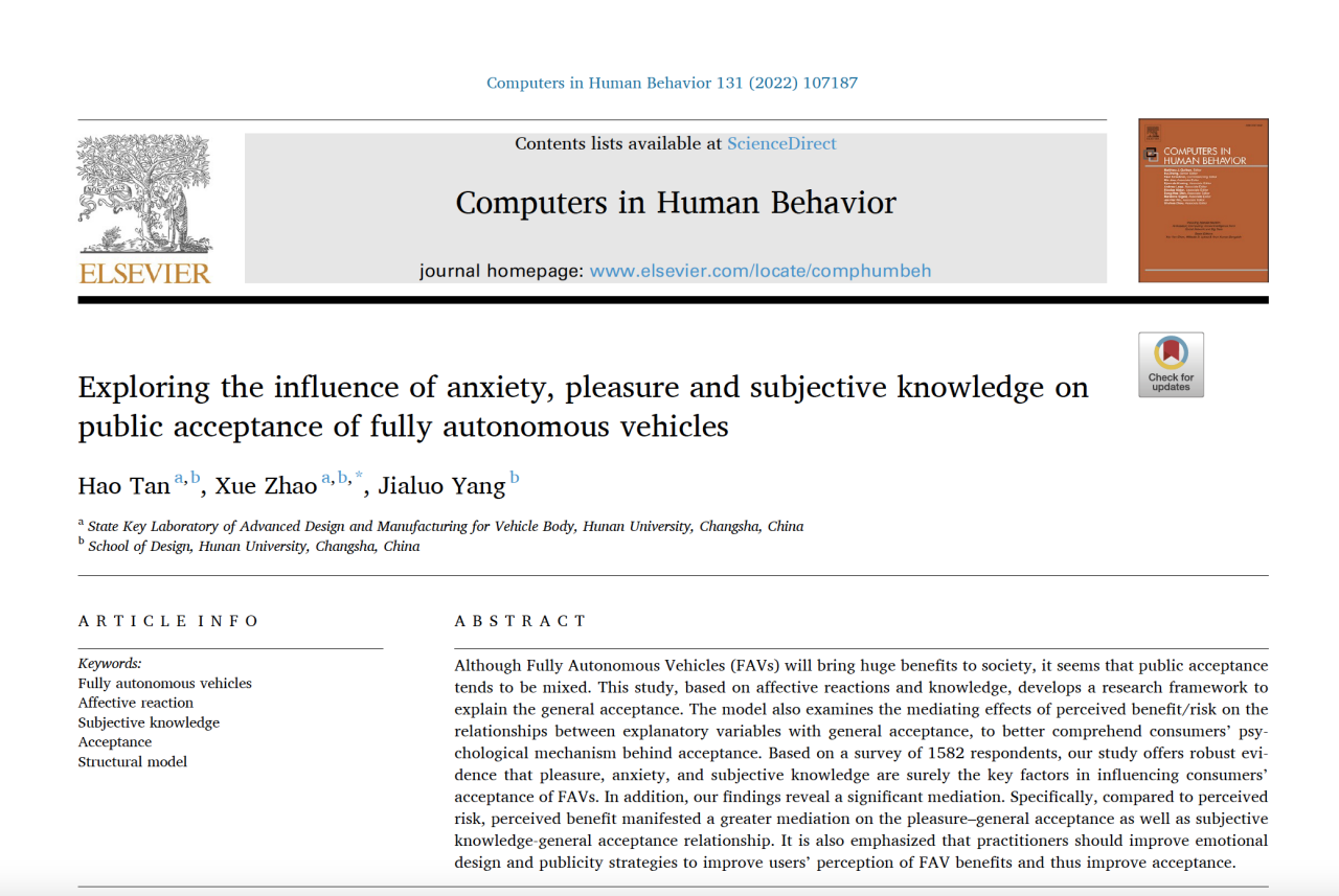 《Computers in Human Behavior》创刊于1985年,是全球艺术与人文科学的顶级期刊,也是人文科学与信息科学、工程科学交叉的顶级期刊。根据Scopus CiteScore在全球艺术与人文科学376本入选期刊中排名第2。球王会官网是该工作的唯一完成单位,谭浩教授为第一作者,2019级硕士生赵雪为通讯作者。该工作得到了汽车车身先进设计制造国家重点实验室自主课题(72165006))和湖南省重点研发计划(2020SK2094)支持。