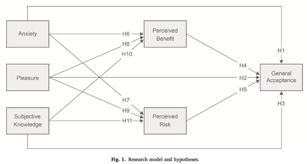 该研究首先基于行为科学与设计学基本理论,构建出一个面向全自动驾驶汽车的接受度的结构模型,将愉悦情感、焦虑情感和主观知识水平作为自变量,将感知风险和感知收益作为中介变量,将接受度作为因变量,根据系统的理论研究提出了各变量之间的假设关系。在此基础上,基于1582名用户的有效样本,开展用户体验的实验研究,并获得的公众的主观知识水平、社会心理因素对接受自动驾驶汽车的定量模型。