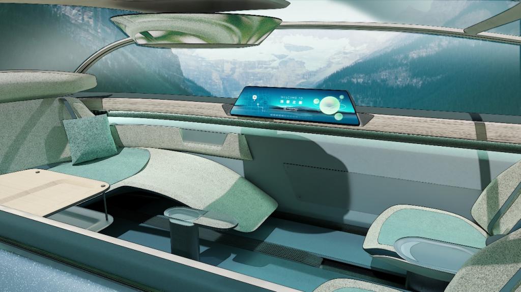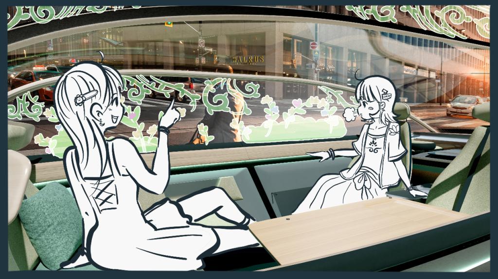 “沐歌”的设计目标是通过多通道的形式,在城市内与周边的自然游过程中,弥补原生自然与城市自然之间的缺口,创造沉浸式的由城市过渡自然的出行体验。行进过程中车窗会渐进出现自然元素,遮掩城市景象。用户与之互动后,这些元素将会生长在座舱中央的全息小岛上。离目的地越来越近,小岛上的自然元素也越来越浓郁。全息小岛还将通过香氛系统与声音系统匹配目的地的气息与声音,在回程路上播放,视听触多通道创造自然沉浸之感。