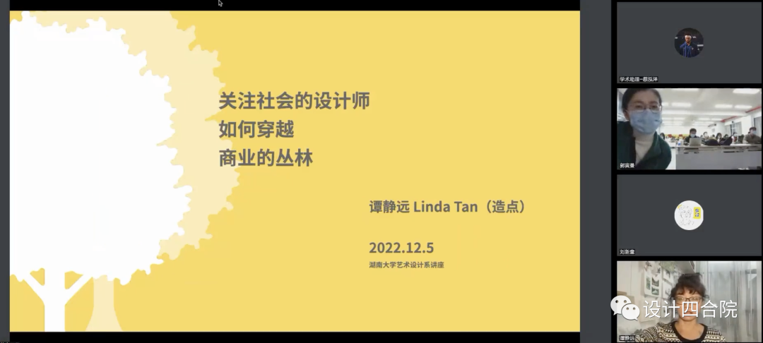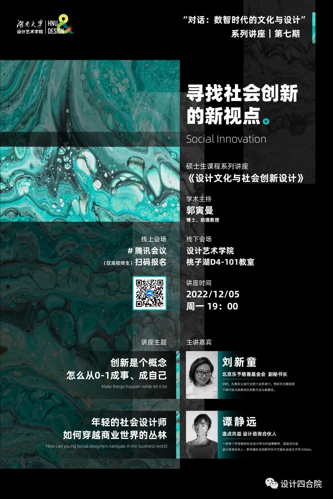 2022年12月5日,在研究生课程《设计文化与社会创新方法》上顺利举办了以“寻找社会创新的新视点”为主题的社会创新实践分享会。本次讲座邀请了在行业中亲身开展社会创新实践的2位青年行动家,北京乐予慈善基金会的副秘书长刘新童和造点共益设计咨询的合伙人谭静远(Linda),讲座由球王会郭寅曼主持。