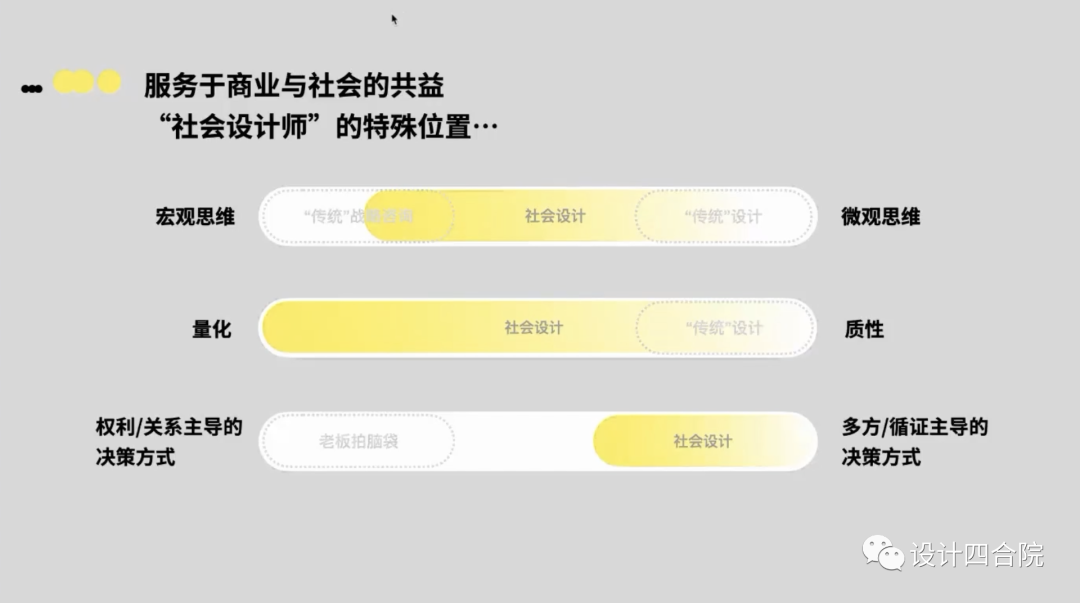 第二部分,在践行“商业与社会的共益”理念中,Linda详细介绍了造点与太古地产、光明乳业以及美团外卖的合作项目,论证了社会设计师在共益设计中的工作方式转变包括了从“微观思维”到“宏观思维”、从“质性”到“量化”,从“权利/关系主导的决策方式”到“多方/循证主导的决策方式”,通过输出报告、产品/试点、机制等不同形式的成果,推动企业共益。
