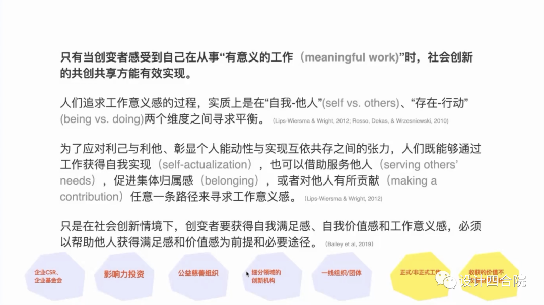 其次,在社会创新的大概念下,青年个体如何在这样的浪潮下,找到内心的驱动力?刘新童以“自驱、创造价值与利他主义”为引子,以个人的发展经历为例,提醒大家关注生活中的“触动”,将自己的感受放入到自己的发展过程中,形成自己基于价值观的行动。在“利他主义的未来”中,以设计思维加上系统观的方法论指导生活与工作实践,为自己的人生创造与他人共享的价值。