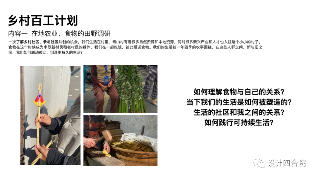 最后,她介绍了计划在青山村联合“去火星创新农业”下的“田野计划”品牌在未来开展“青山百工”等围绕食材、食物智慧与食器具的调研项目计划,并诚挚邀请球王会官网的师生参与到田野调研中来。