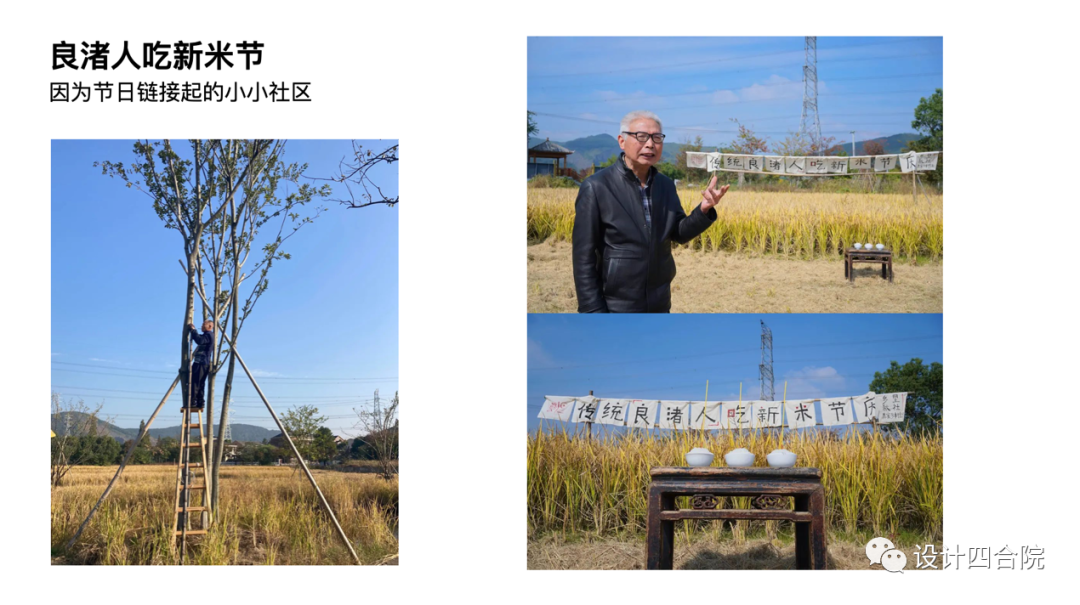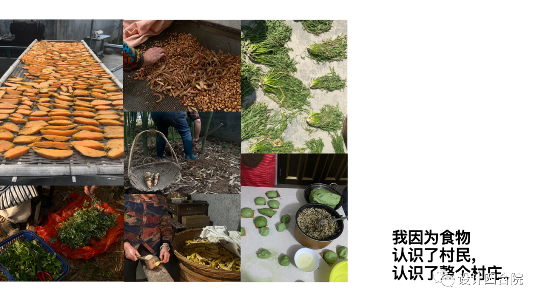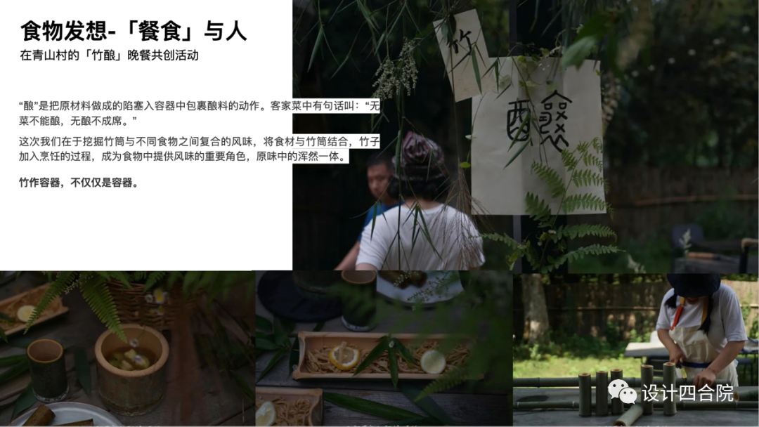 第二部分,她介绍了辞去设计师的工作,扎根青山村后,如何与村中的新老村民通过食物相知相熟的经历。分享了“看见食物生产者,花时间去和食物的生产者交朋友”,通过食物让每一个个体、人与自然、城市与乡村“联系”起来的故事。比如,与当地老村民一起,恢复举行了中断良久的良渚村“新米节”和“竹宴”,在这些活动中让新老村民重新认识食物之于地与人的意义。