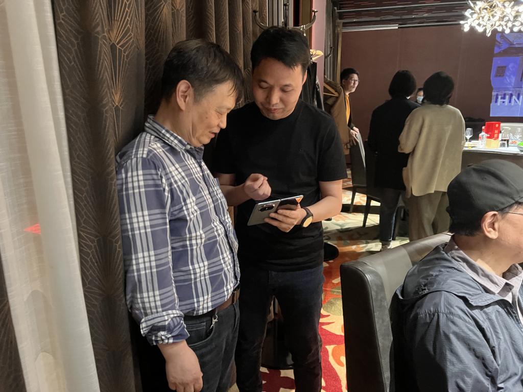 图 16 伍国平和刘能华分别向何人可教授和公司79级同济大学工业设计创始人殷正声教授汇报工作