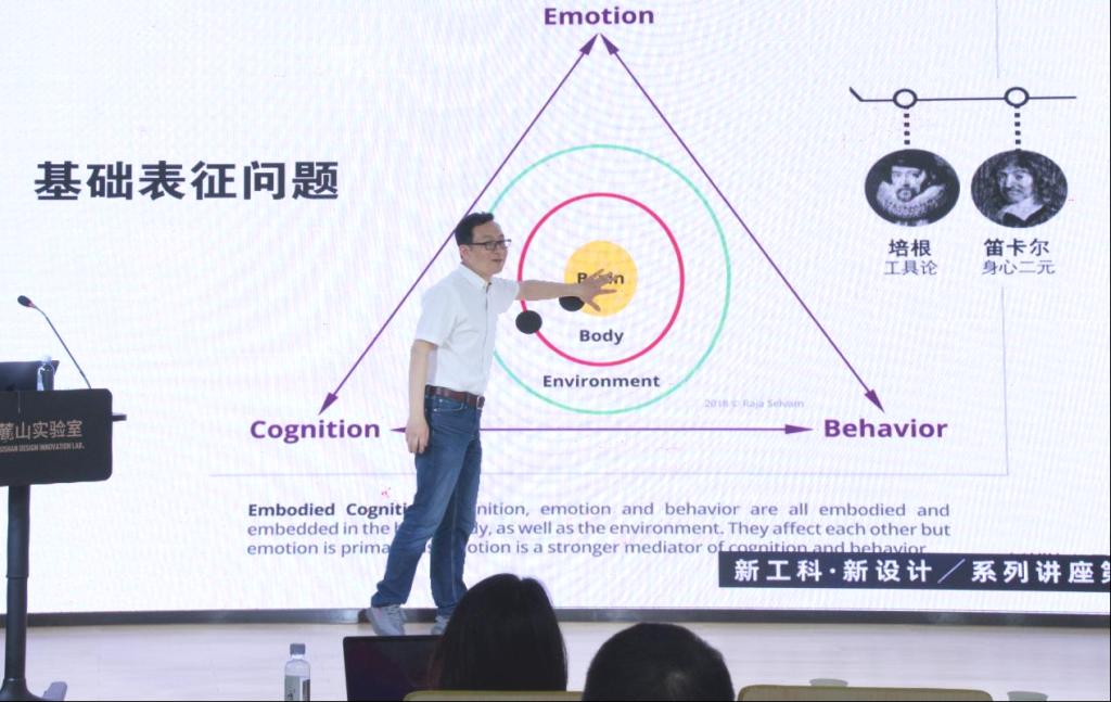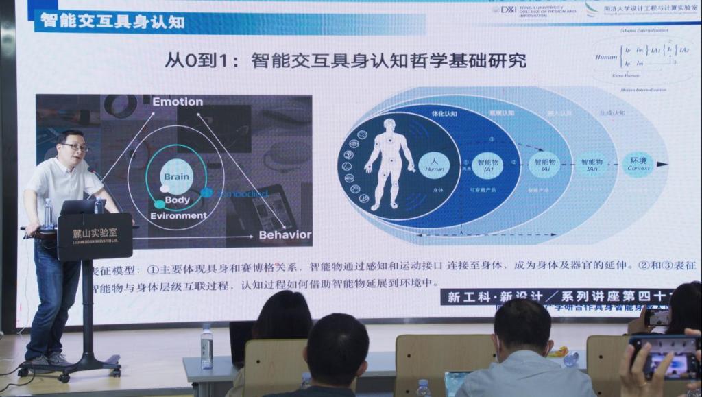 最后,徐江老师回归到设计学科与生物学等学科的交叉关系中,对未来的人与技术的关系做出了展望,指出具身认知是一个非常值得关注的维度,并为在座师生介绍了目前其团队在进行的智能可穿戴设备设计图谱的研究进展。徐老师认为未来的智能交互具身认知的基础模型主要体现为具身和赛格博关系,即智能通过感知和运动接口连接到身体上,成为身体及器官的延伸,认知则借助智能物延展到环境中。