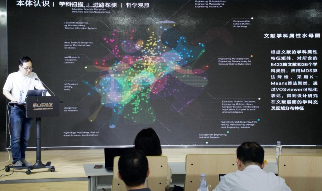 首先,徐江老师介绍了他的团队在设计学知识图谱构建方面所做的研究。一方面,通过大量的文献研究,构建学科知识图谱以深入分析设计研究在文献层面的学科交叉区域分布特征。徐老师以此为基础,对不同时间段的设计交叉研究情况进行分析,提出了未来设计学科发展的方向,表示未来设计学科将极有可能与包括生物学科在内的众多学科产生更为紧密的联系。另一方面,从设计学科研究的共引关系出发,徐老师又为大家介绍了他的团队在设计学作者共被引网络图谱方面的研究,以此为依据,将当前设计学主流学术群体概括为包括设计知识、设计历史等在内的八个领域。