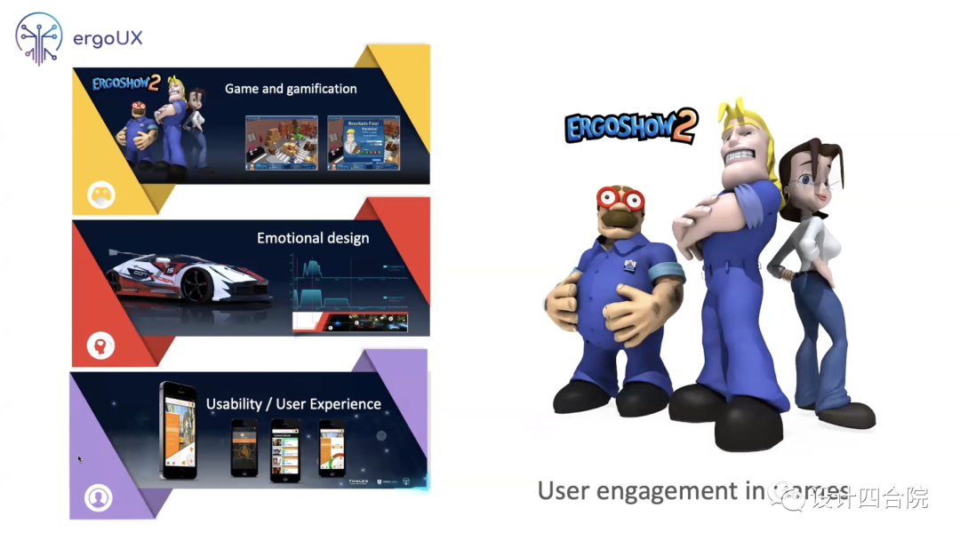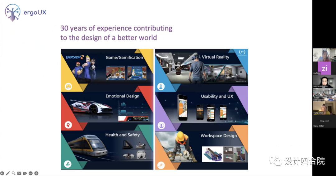 Francisco Rebelo博士首先强调了人机交互中以人为中心的设计核心,讨论了人、机器和整个世界之间的相互作用关系,并以此引出ergoUX工作室在过去30年发展中形成的三个主要方向:(1)可持续和高效的世界,(2)让人们的生活更加有趣、健康、安全以及(3)实现个人价值。此外,工作室还开发了六个模块,分别是游戏化设计、虚拟现实、情感化设计、可用性和用户体验、健康和安全以及工作空间设计。
