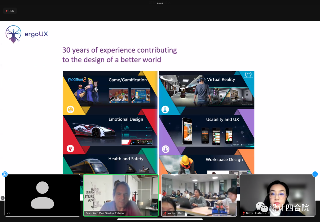主讲嘉宾Francisco Rebelo是UL·ergoUX-人机工程学与用户体验实验室主任、人机工程学博士,此次分享围绕“创造价值,让人们的日常生活更有趣、更健康、更安全”这一主题展开。同时,围绕用户体验与人机工学的研究项目,球王会、里斯本大学建筑设计公司双设计学博士、现中国美术公司球王会工业设计系讲师王子豪学长一同进行了在线分享。讲座由球王会助理教授栾之珑主持。在本次讲座中,同学们通过线上连线与Francisco Rebelo博士和王子豪学长展开了精彩的交流互动,他们的分享涵盖了人机交互领域多个不同的实践主题,详细了展示了许多有趣的案例和实用技巧,内容精彩有趣且富有启发性。