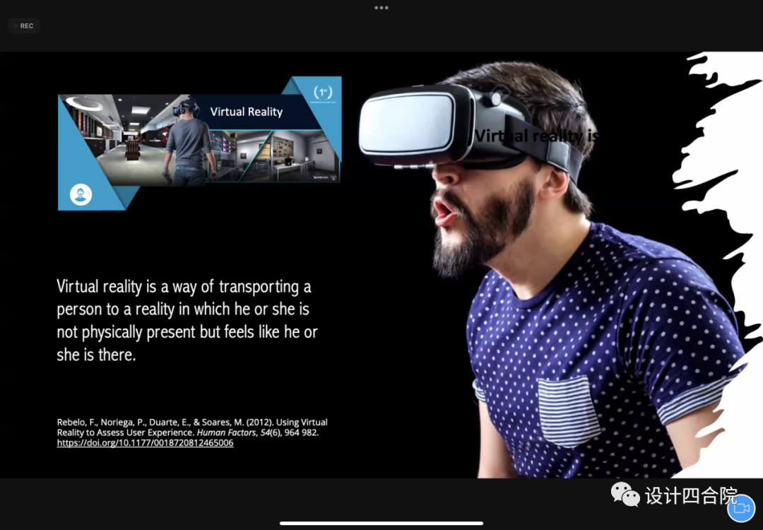 Rebelo博士认为VR技术的应用十分有助于设计师的研发工作,特别是在项目落地前的模拟测试和用户评估阶段。但博士认为理解VR技术应用研究的核心问题应该是:虚拟现实是真实的吗?博士以工作室的VR体验活动为例,阐述了他对于“真实”的定义:只要体验和感受是真实的,虚拟世界也可以算作另外一种类型的“真实”;“真实”是我们的感觉器官对世界产生的感知,是大脑认定的“实在”。