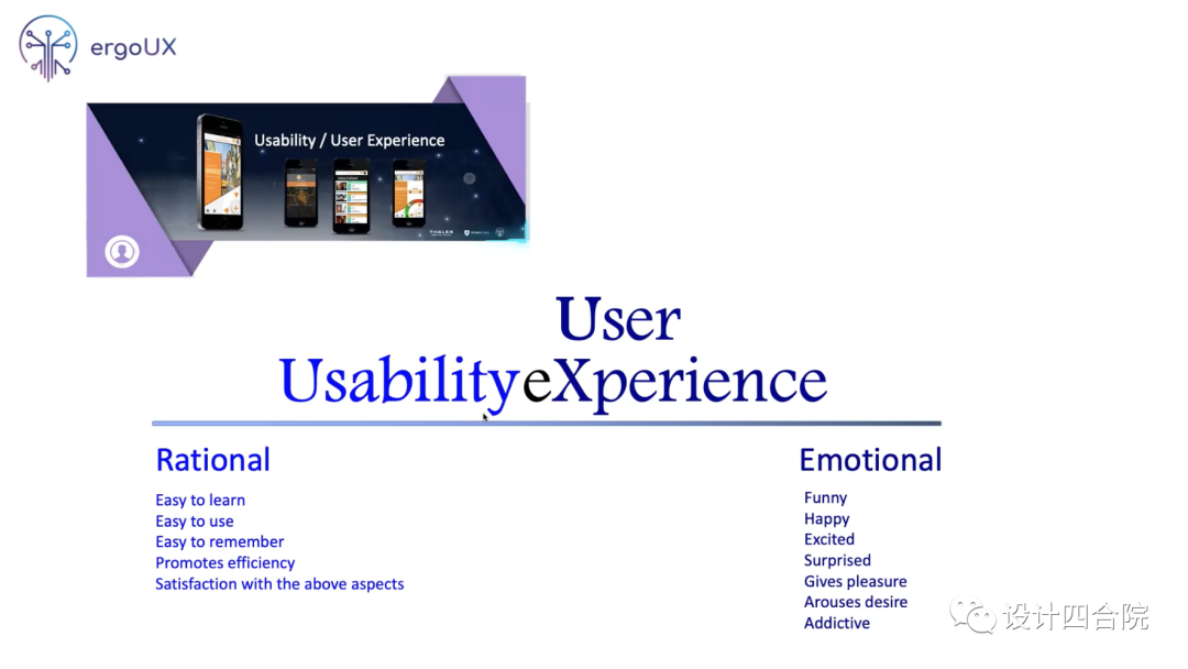 第二部分Rebelo博士解释了可用性(Usability)和用户体验(User Experience)的异同。博士认为,可用性是基于理性的判断,它要求产品或服务具有易记忆性、易用性、易学习性、能够提高效率以及使用过程中产生积极情绪等特点。相较之下,用户体验则更加强调人们与产品互动时的感受,更加偏向感性。这二者对于设计来说都同样重要,需要设计师在设计过程中兼顾二者的平衡,才能产出好的设计。