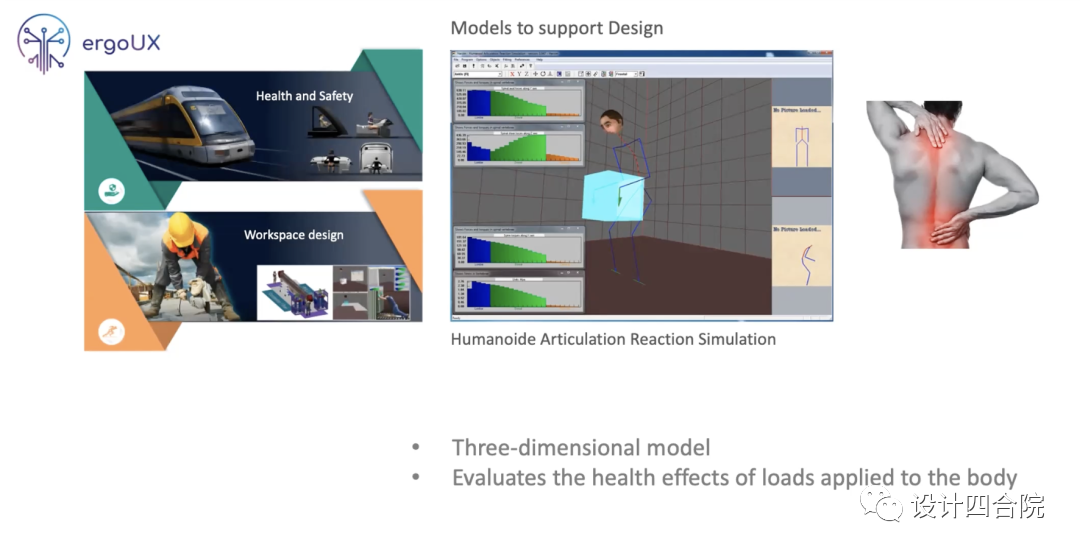 Francisco Rebelo博士介绍了利用数字人体模型在促进工人(Workers)的健康和安全方面所提供的系统性解决方案和优化设计应用。数字人体模型可以对人体进行精确的建模,捕捉身体尺寸和关键特征数据,以及身体残疾等特殊情况。利用这些数字模型框架,可以获取人与产品交互时的人体动作数据,从而帮助设计师对自由空间、活动范围、身体姿势等进行评估,从而更好地保障工人的健康和安全。
