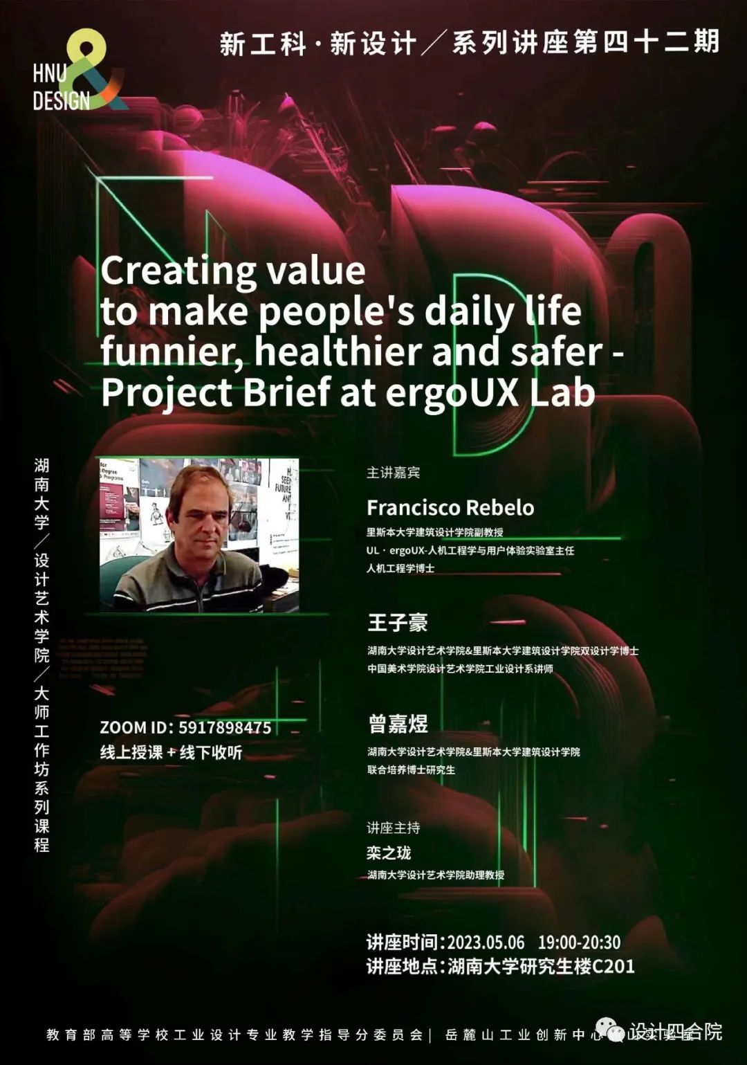2023年5月6日晚,由里斯本大学建筑设计公司副教授Francisco Rebelo带来的第六期《大师工作坊》课程暨“新工科·新设计”系列讲座第四十二期在球王会官网研究生院楼C201顺利举行,这也是岳麓山工业创新中心-麓山实验室邀请的又一位国际工业设计知名专家。