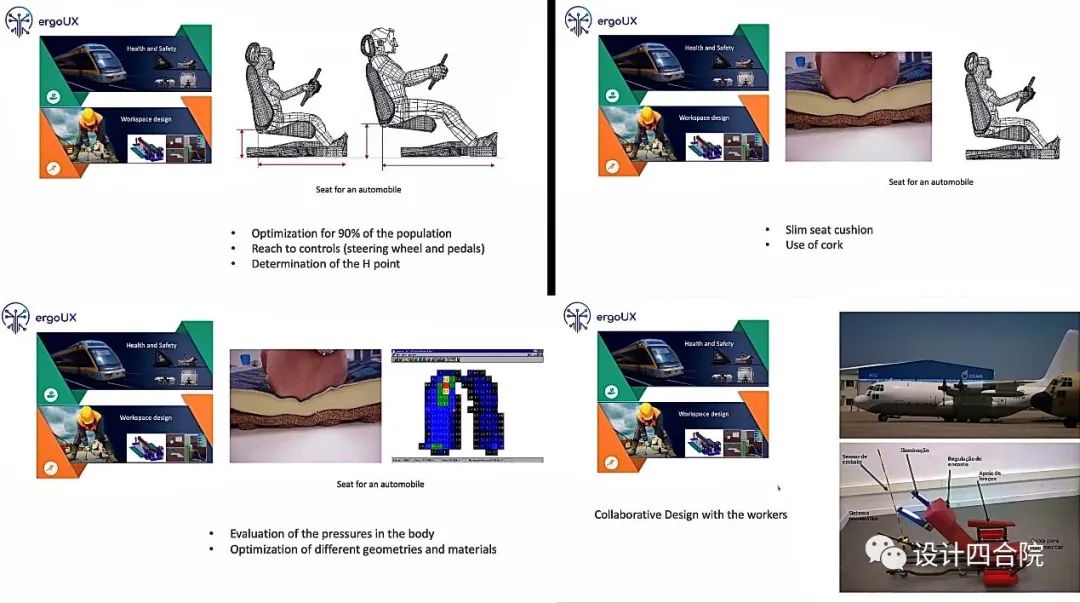 Rebelo博士以驾驶舱座椅的优化设计为例,具体说明了如何利用数字人体模型进行作业场景的分析和优化,以及如何将这些优化措施转化为工业设计的结果。他指出,进行设计研发的过程需要保证方案的可行性,不能只停留在理论层面;设计师需要有定量的信息和可以付诸实践的数据作为支撑。数字人体模型则可以提供这些实用的数据和信息,帮助工程师和设计师更加精确地进行设计和评估。