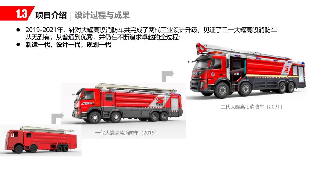 为全面提升三一应急装备整体工业设计水平,2019至2021年,三一针对大罐高喷消防车共完成了两代工业设计升级。2017-2019年的“第一代”消防车确立了消防车的整机工业设计,初步形成了三一应急救援装备的整机识别系统。2020-2021年,“第二代”消防车对整车造型及乘员室内外饰进行了升级,以此为起点,三一消防装备产品的整体形象逐步提升。期间团队针对二代大罐高喷消防车进行多种造型及风格尝试,组织开展了四轮方案设计及评审,最终在综合考虑美观度、工艺性、经济性等维度后,经过决策优化得到了最终的工业设计方案。