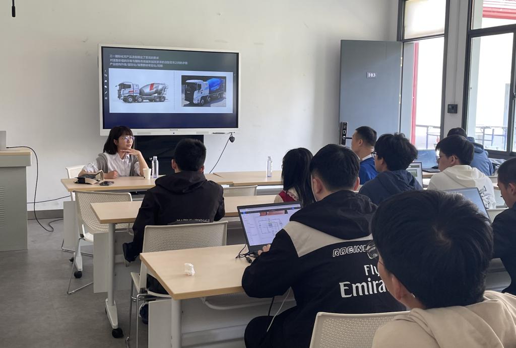 随后,黄莹结合自身经历的实际案例,为同学们介绍了装备设计流程及维度。黄莹向同学们分享了获得2021年三一优秀设计奖的大罐高喷消防车的设计全流程,并分为三个部分进行讲述,分别是项目介绍、产品创新程度、市场表现及经济效益和知识产权成果。