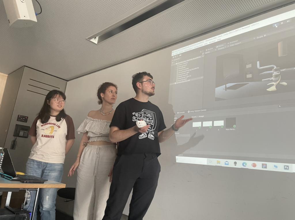 工作坊前期,袁翔老师向德方师生介绍了“球王会官网工业设计的专业教学特色”,钟鸣老师向德方师生分享了“AIGC趋势下设计工作流的转变”。 球王会官网和普福尔茨海姆大学的员工们也分别介绍了他们在前期课程中取得的设计成果,包括基于Unity、Arduino和OpenCV的交互展示方案以及产品概念设计与动画。