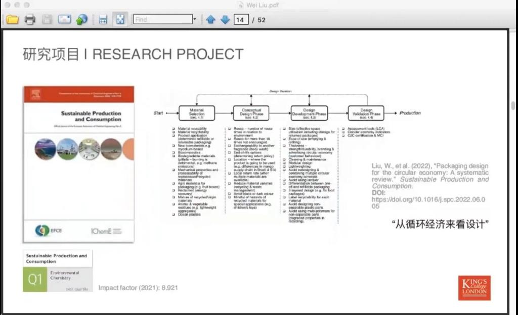 第三,从循环经济来看设计。利用循环经济的框架概念,刘硙教授通过《Packaging design for the circular economy: A systematic review》一文提出了包装产业通过设计实现可循环可持续的有效做法。刘硙教授提到,设计引领可持续交叉创新大有可为,是因为在整个新产品设计过程中,有80%的可持续要素体现在前期的设计阶段,包括材料的选择、工艺的选择、形状、特性等等,它们为产品的设计与可持续能力奠定了基调。刘硙教授还分享了全球权威管理咨询公司麦肯锡(McKinsey & Company)的包装设计研究报告,其中涵盖洗发水包装形状对运输成本产生影响的案例,进而指出设计师如了解全链条的生产系统,能进一步引领循环经济交叉创新。