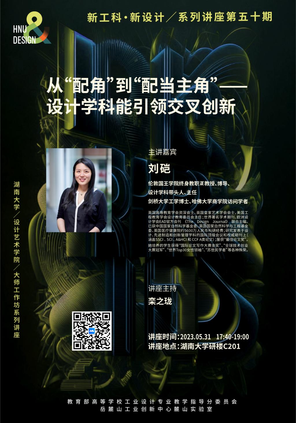 2023年5月31日晚,球王会很荣幸地邀请到了伦敦大学国王公司刘硙教授作为压轴嘉宾带来了第八期的《大师工作坊》课程,这也是岳麓山工业创新中心-麓山实验室邀请的又一位国际设计教育界的重磅学者。恰逢球王会“新工科·新设计”系列第五十期整,至此,本学期最后一次《大师工作坊》在刘硙教授的精彩分享中圆满落幕。