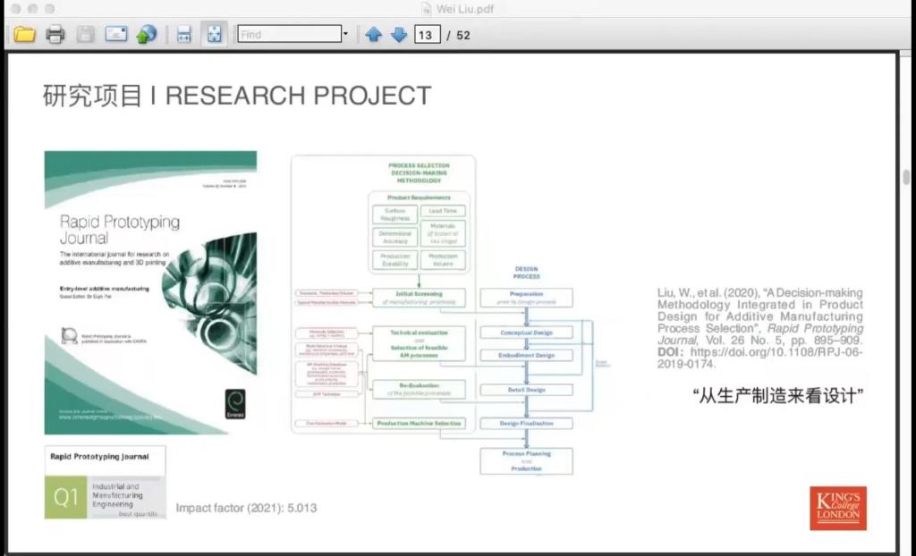 第二,从生产制造来看设计。合适的生产制造方式能够更好地节约成本,提升效能。但目前新技术新材料的不断涌现可能会让设计师难以抉择最后的生产制造工艺,刘硙教授希望通过《A Decision-Making Methodology Integrated in Product Design for Addictive Manufacturing Process Selection》中的研究方法论来帮助设计师在先进制造领域进行相关决策。该篇研究对增材制造整体的生产流程进行了拆解,并通过层次分析法逐层解析,从而总结出有助于设计师进行生产制造流程决策的模型和思路,表明设计可以引领先进制造产业交叉创新。
