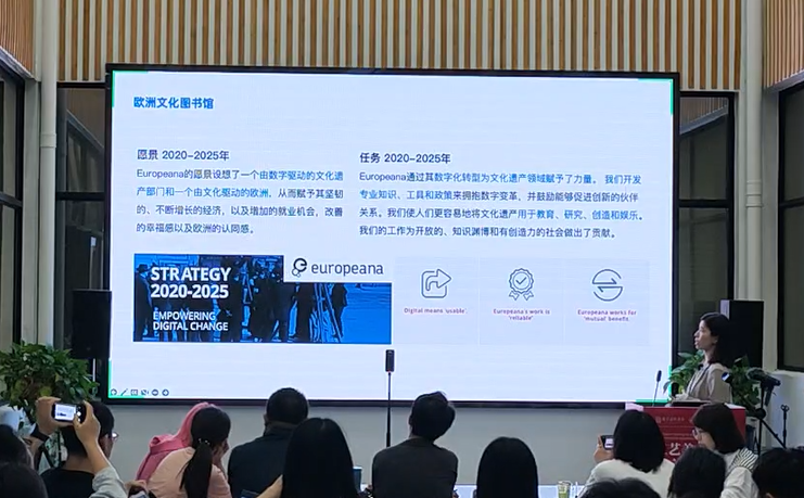 为了更直观的了解当前以博物馆为代表的文化数字化平台发展现状,郭老师展示了世界范围内著名的博物馆数据,例如美国大都会博物馆,其线下藏品超过100万件,当前线上平台展示的藏品有45万余件,占总藏品数量的50%。英国维多利亚阿尔伯特博物馆,其线下藏品超过230万件,是世界上最大的艺术和设计博物馆,当前线上藏品数据有120万余件,包括86万张图像,占总藏品量的52%。而中国故宫博物院线上平台公开展示10万余件/套藏品,仅占总藏品数量的5.4%。通过数据我们可以看出我国在文化数字化进程中还有很大的发挥空间,而在数字环境下设计国家文化数据平台,还应该考虑到如何与现有平台产生协同共创,以便与相关行业进行合作,确保文化数字化工作的可持续性,从“数据孤岛”到文化大数据,海纳百川,互学互鉴,实践库际间数据互联共生。