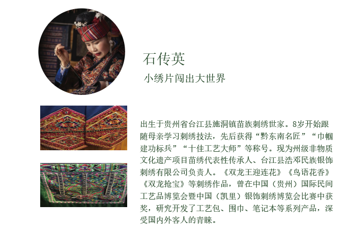 创作者通过网络采集与线下走访,收集大量的苗族刺绣传承人的信息以及他们的苗绣代表作,并将其进行分类、整理与简化提炼,最终整理出了杨再美,石丽萍,潘玉珍,石传英等四位国家级、省级苗绣非物质文化遗产传承人的肖像动态数据和苗绣纹样数据,进行动态交互。