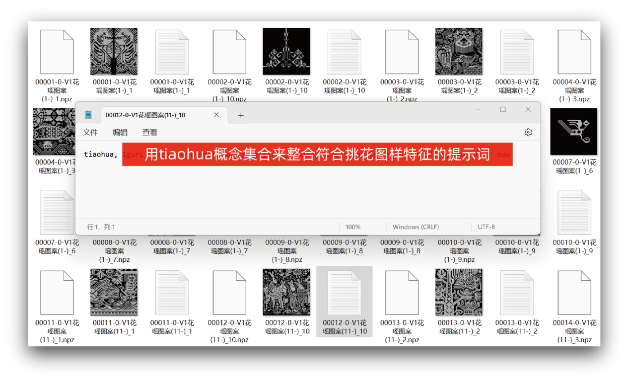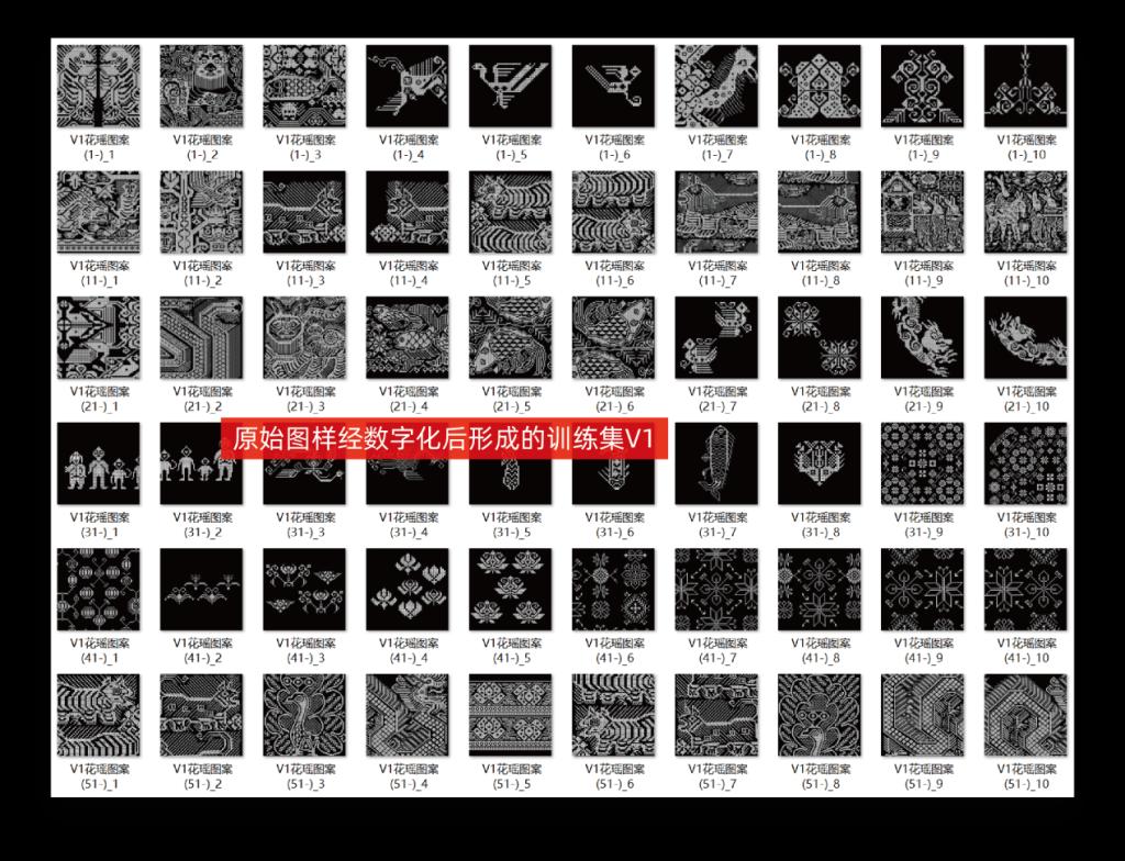 首先,对大量的原始素材进行分类、整理与图像处理,然后根据模型训练的要求建立图形训练集,并对训练集内的每张图片进行标签优化,形成属于“花瑶挑花”的概念集合。