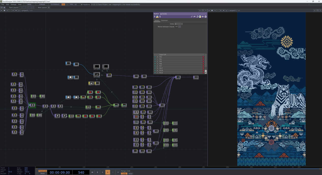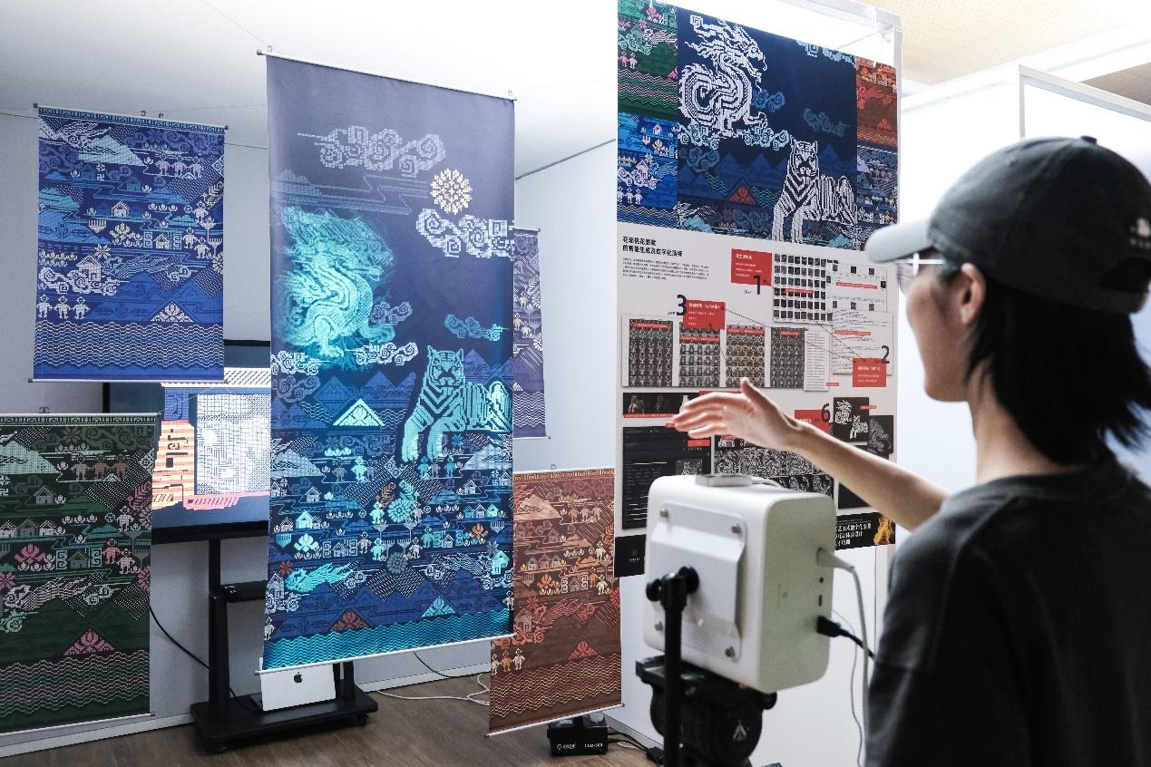 作品通过数字化演绎的方式,探索花瑶挑花非物质文化遗产的传承与传播的更多可能性。展览后部区域,以展示挑花基本单元符号特征随机生成的形式,象征传统挑花图案“看见什么挑什么”的独特创作方式。展览主图区域,选取龙、凤、虎作为花瑶地区典型意象图案,以展示智能生成技术辅助生成的创新图案,并通过交互装置与参观者建立连接,观者可通过手势切换的交互形式,深度体验传统资源数字化传播的魅力。