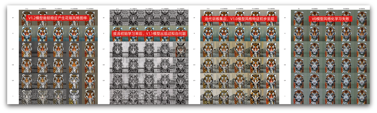 其次,根据我们的训练目标选择合适的大模型进行微调模型训练,通过对参数与脚本的不断调整获得花瑶挑花风格的微调模型完成测试与迭代。从第一版的风格学习失败,到模型过拟合,这个过程并不是一帆风顺的,且本次呈现的训练成果也仍有较大的升级空间。
