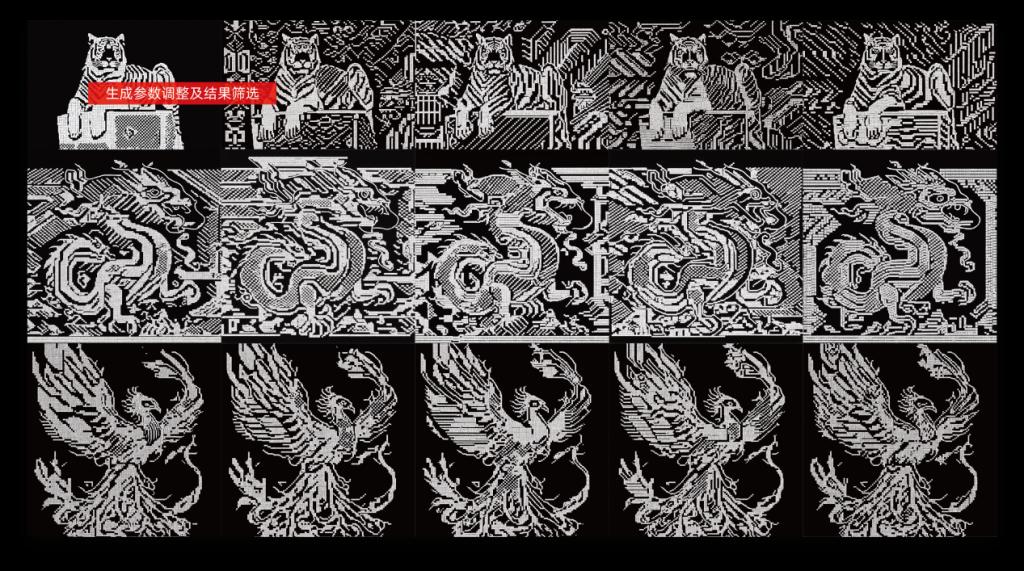 在实际工作中,我们发现想要产出特定的图案,单靠文本描述较难达到项目要求,还需增加更多的限定条件使得产出过程变得更加可控。例如,使用ControlNet插件获得参考图的深度图、线框图和骨骼图等更多信息,再不断调整生成参数让人工智能生成更多的可能性,最终经由设计师和非遗传习者的经验性审美筛选出合适的生成结果。