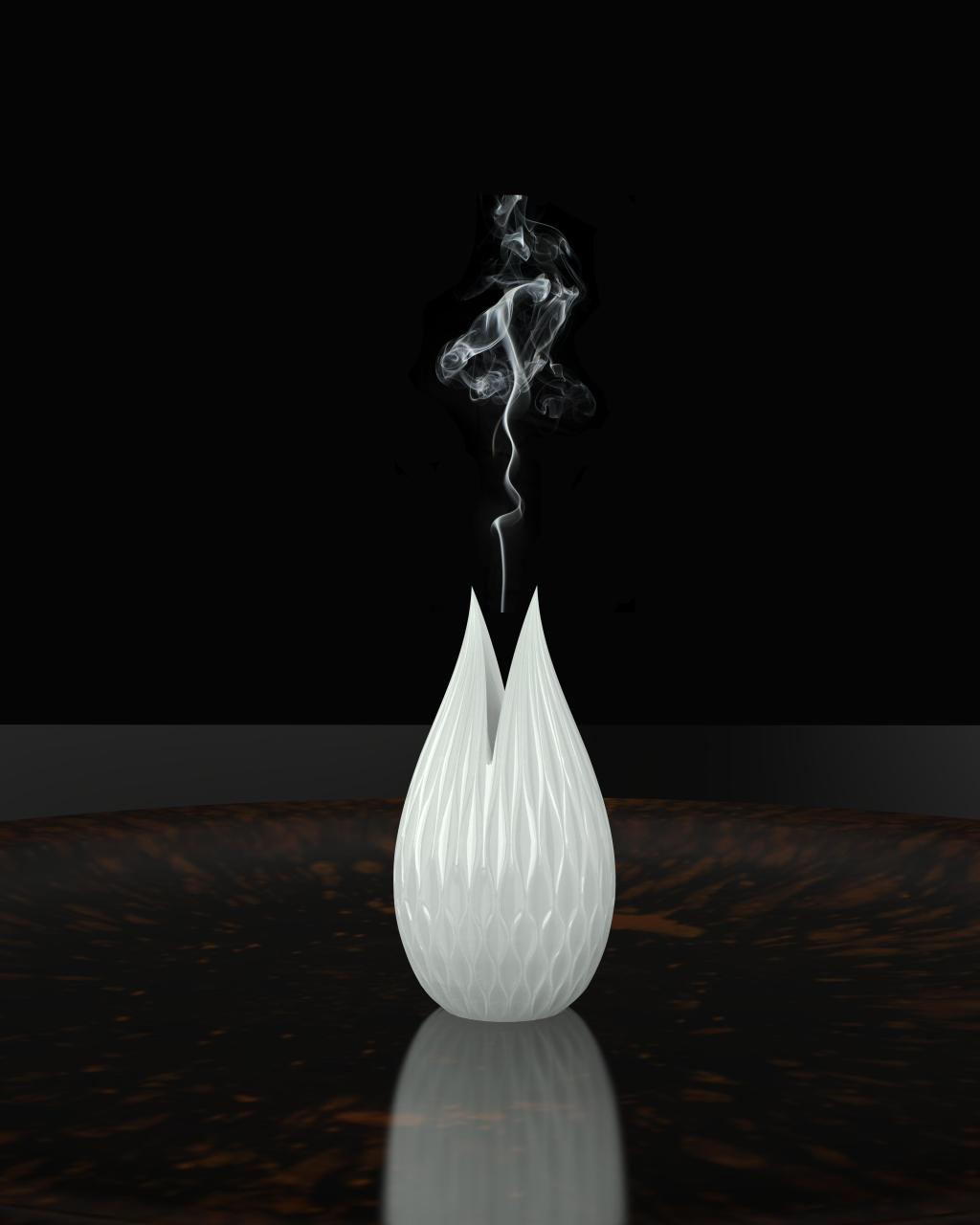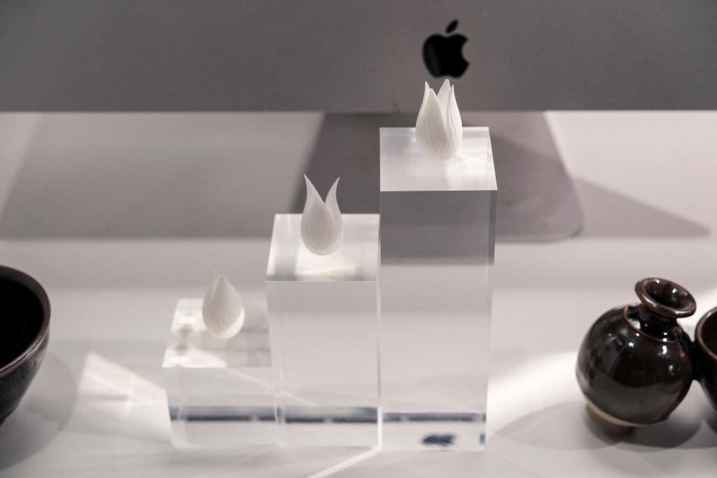 作品以图表、演示动画和作品的形式展示出项目的逻辑方式、技术线路和最终方案。图表主要演示了如何利用编程软件模拟并生成新的数字图案;最终的方案通过光固化3D陶瓷打印的方式将三件形态关联、同系肌理的陶瓷香插以产品形式展出。期间也展示了北宋、金元明清时期烧制黑釉瓷的实际煤窑烧制技艺,正是这样的传统煤烧工艺结合本体的胎土和釉材,才能产生出绚烂多彩、意蕴丰富的耀州窑黑釉瓷。