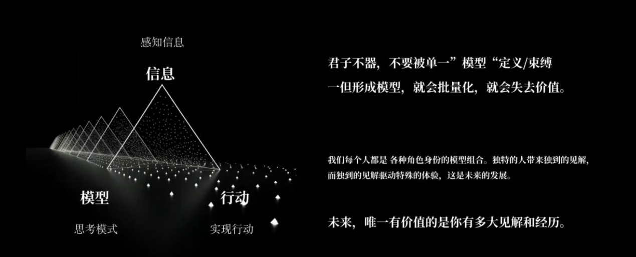 同时,王丹老师认为:不要被单一的模型定义、束缚,要突破原有的认知模型,创立新的模型。不要被固定的路径所束缚,不断吸收新的信息,构建新的模型,采取新的行动。