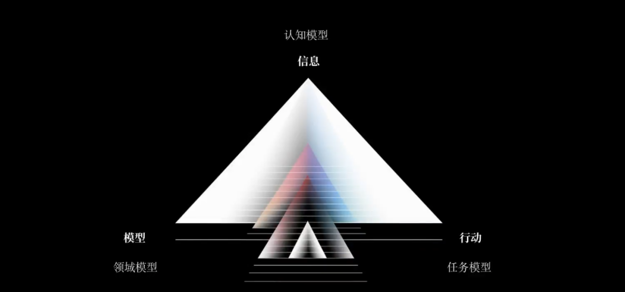 王丹老师借用陆奇“三位一体结构演化”认知世界的模型,阐述了AIGC时代概念创新的变化。三位一体结构,即信息系统、模型系统、行动系统。信息系统代表从环境中获取信息,模型系统代表对信息的表达、推理和规划,行动系统代表与环境做交互,达到目的。