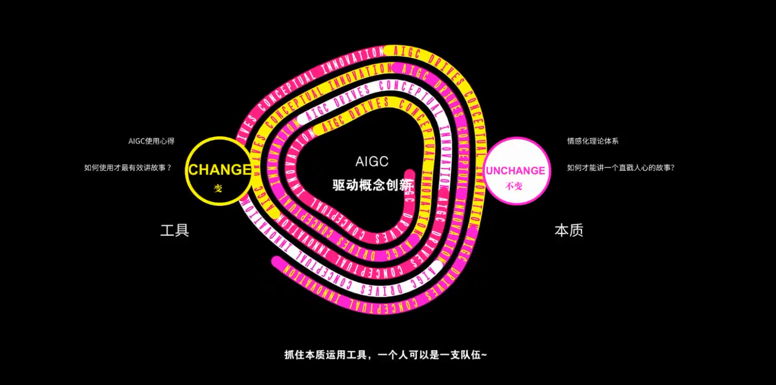 在AIGC时代,概念创新的变与不变相辅相成,变的是不断去选取新工具,不变的是要讲述一个直戳人心的故事。决定AI使用的上限是个人对世界完整的认知和个人的语言能力,利用新工具让设计重回想象。